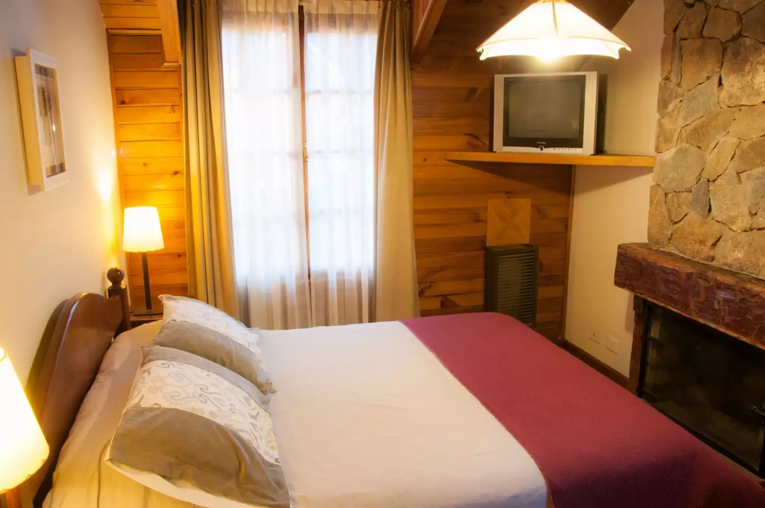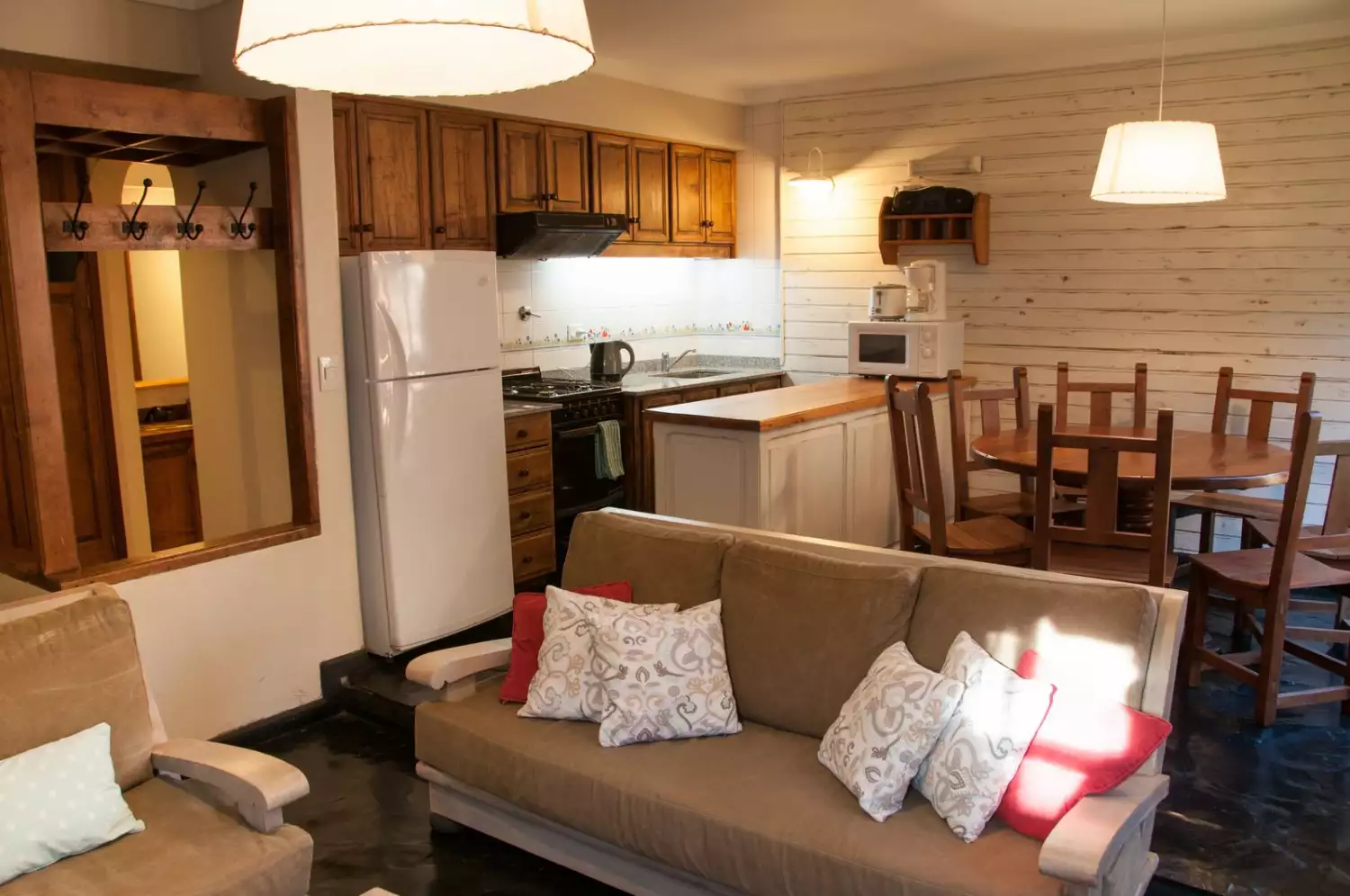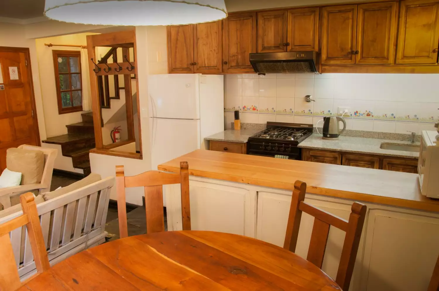 - First floor: Kitchen-dining room integrated with the living room, balanced draft heater, fireplace, 32" LCD, and a full bathroom with shower.